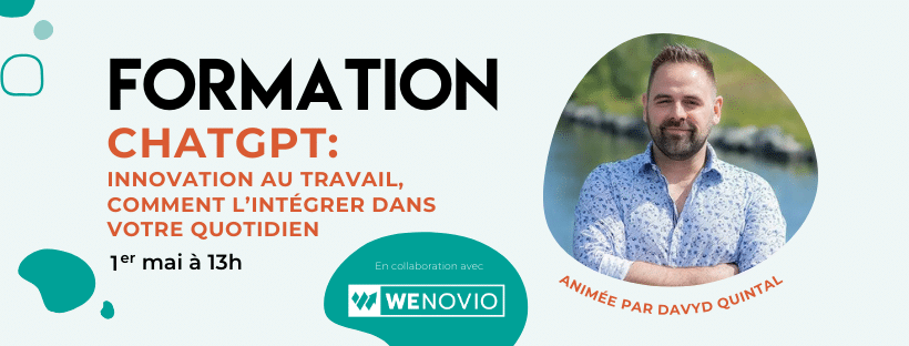 L’intelligence artificielle (AI) est définitivement un outil numérique avec lequel les entreprises devront se familiariser de plus en plus pour palier plusieurs enjeux organisationnels. C’est pourquoi, nous vous proposons une formation de 2 heures entourant l’utilisation de ChatGPT, le 1er mai prochain, à 13h, par le directeur de l’Agence Wenovio, Davyd Quintal.